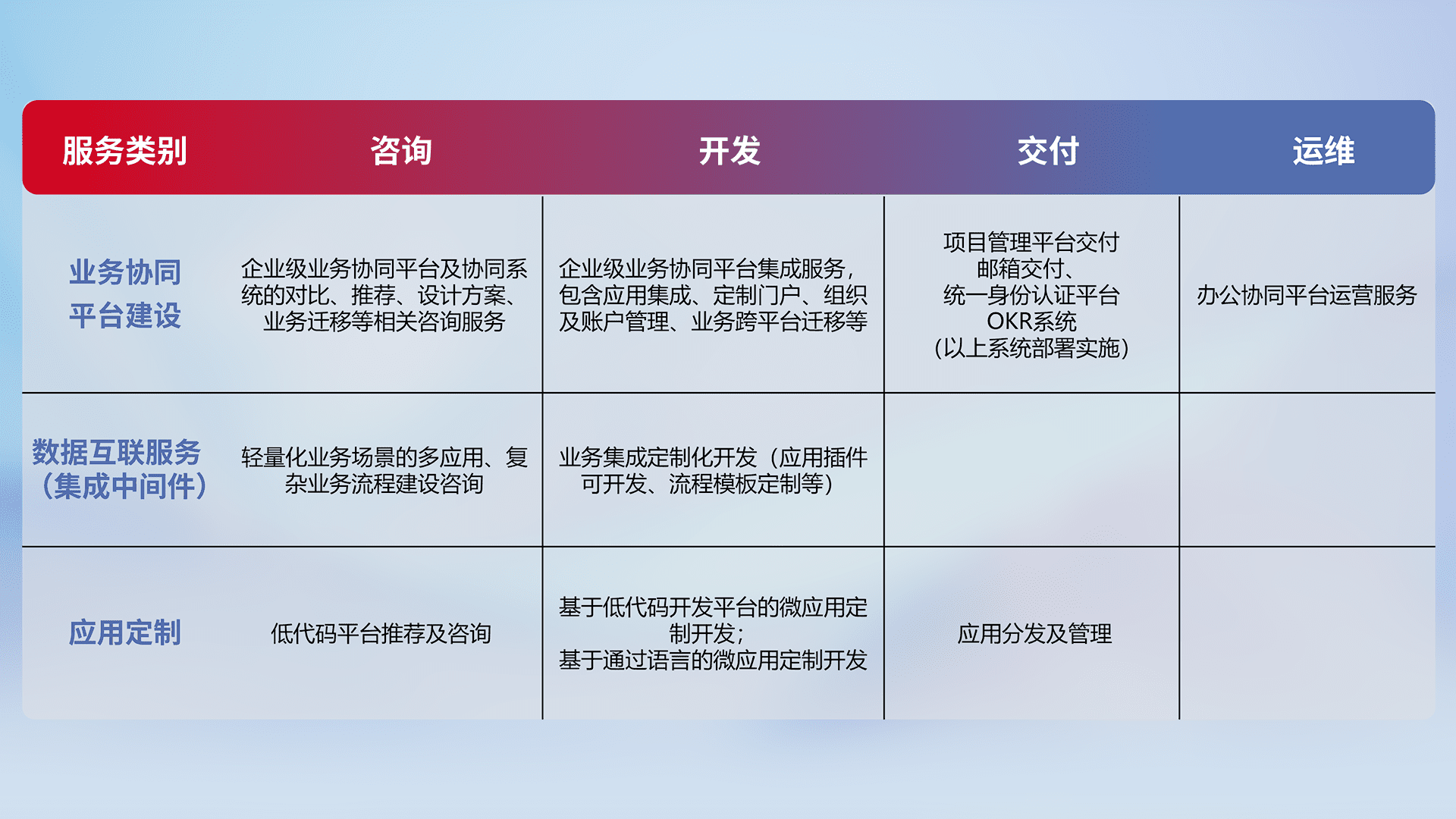 针对钉钉、、企微、、、、IDaas等平台级产品提供产品的规划、、、、方案、、交付、、、定制化开发等服务,,,,实现如统一协同办公、、、智能客户服务、、、、混合会议管理、、、、智能数据查询、、、等业务场景,,实现数字化转型。。。